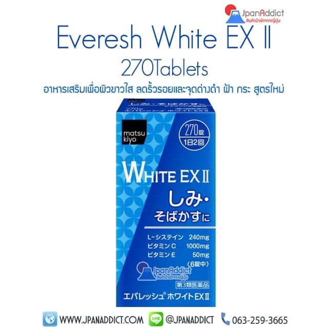 Everesh-White-EX-II-270 Published พฤศจิกายน 16, 2018 at 640 × 640 in Everesh White EX II 270เม็ด อาหารเสริมเพื่อผิวขาวใส ลดริ้วรอยและจุดด่างดำ ฝ้า กระ สูตรใหม่ Everesh White EX II 270เม็ด อาหารเสริม