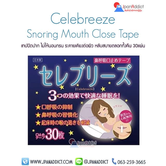 Celebreeze Stop Snoring Mouth Close Tape เทปปิดปาก แก้นอนกรน 30แผ่น ด้วยนวัตกรรมยอดฮิตจากญี่ปุ่น ที่จะช่วยคุณแก้ปัญหาการกรนของตัวเองและคนที่คุณรักด้วยเทปกันกรน ที่จะช่วยปิดปากและไม่เป็นที่ระคายเคียงต่อผิวของคุณตลอดทั้งคืนอย่างแน่นอน การันตีด้วยการเป็น Best Seller ที่ญี่ปุ่น