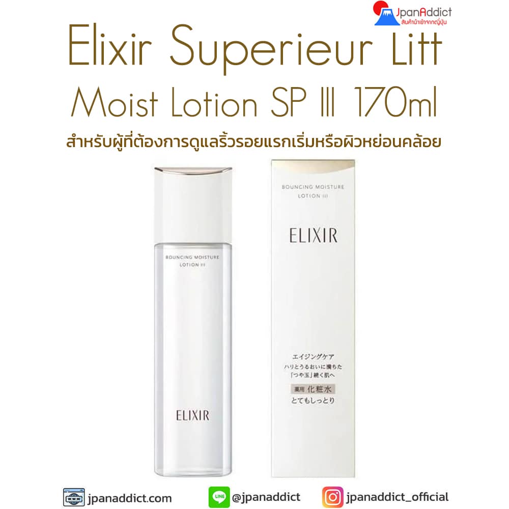Elixir Superieur Lift Moist Lotion SP III 170ml โลชั่นน้ำตบเพื่อผิวกระชับ ชุ่มชื้น อ่อนเยาว์ จากญี่ปุ่น เปิดประสบการณ์ผิวอิ่มฟูและกระชับอย่างมีชีวิตชีวาด้วย ELIXIR Superieur Lift Moist Lotion SP III จากแบรนด์ Shiseido Japan ขนาด 170 มล. โลชั่นน้ำตบสูตรเข้มข้นในกลุ่ม Aging Care ที่ออกแบบมาเพื่อเติมเต็มความชุ่มชื้นให้ผิว พร้อมช่วยลดเลือนริ้วรอยและความหย่อนคล้อยอย่างเห็นผล