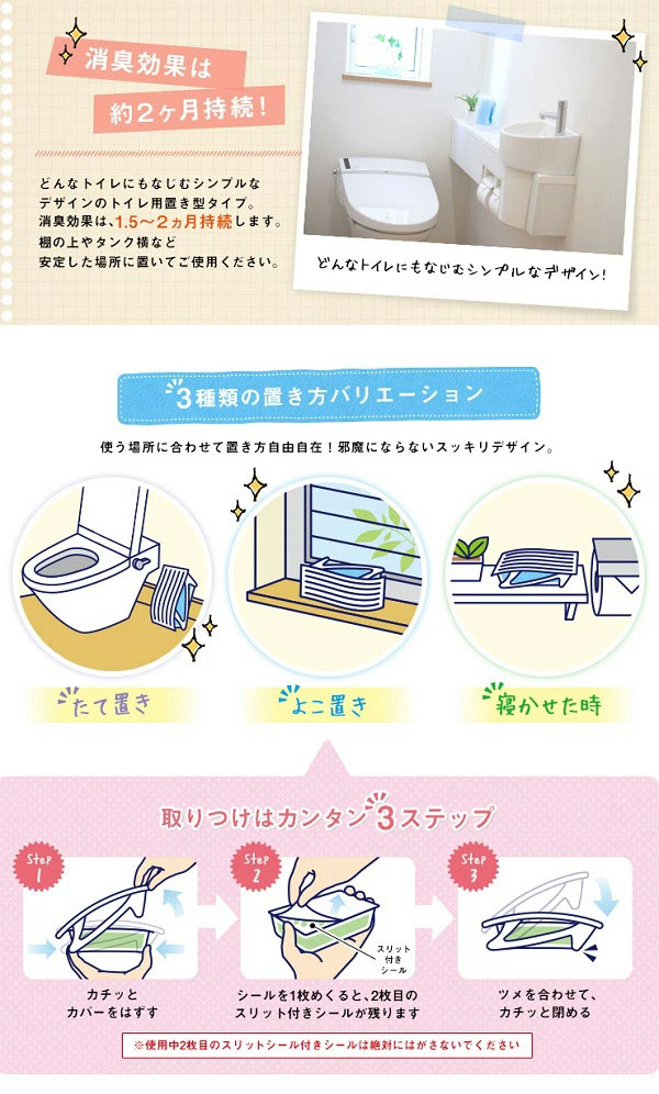消臭効果は1.5~2ヶ月持続します (使用状況による) 3タイプの置き方ができます