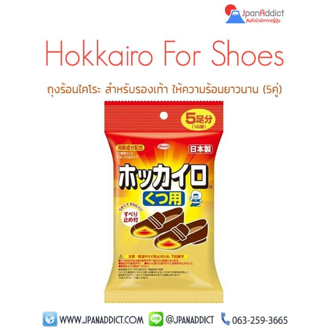 Hokkairo For Shoes ถุงร้อนไคโระ สำหรับรองเท้า ฮอกไกโร (Hokkairo) หรือ ไคโร (Kairo) คือถุงร้อน ข้างในบรรจุด้วยผงถ่านดำ จะเริ่มร้อนก็ต่อเมื่อเราขยำ หรือลอกแผ่นที่เสื้อเรา ความอุ่นของร่างกายเราจะทำปฏิกิริยากับไคโร ทำให้ไคโรเริ่มร้อนขึ้นนั่นเอง อุณหภูมิจะอยู่ที่ร้อนสุดประมาณ 60℃ และจะลดลงเรื่อยๆ ตามระยะเวลาที่ใช้งานค่ะ และถ่านข้างในจะเริ่มจับตัวเป็นก้อนๆ โดยปกติแล้วจะร้อนอยู่ได้นานประมาณ 12-24 ชม.