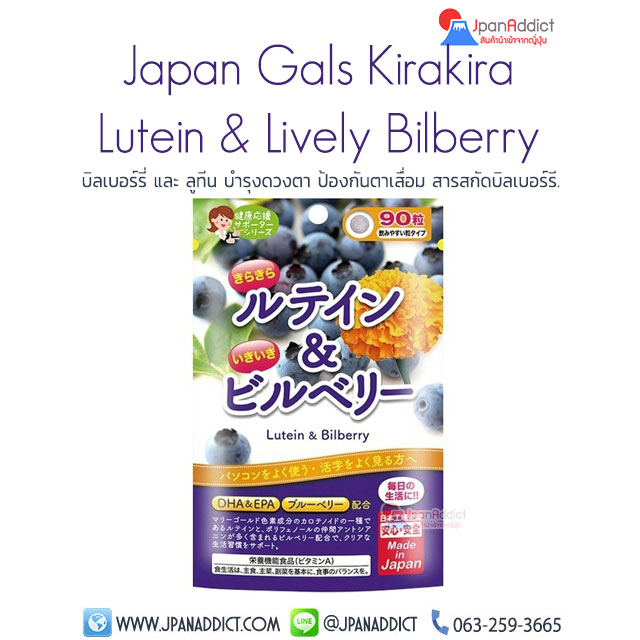 Japan Gals Kirakira Lutein & Lively Bilberry 90 เม็ด บิลเบอร์รี่ และ ลูทีน บำรุงดวงตา ป้องกันตาเสื่อม ลดอาการแสบตาและเคืองตา ชะลอการเกิดต้อกระจก ลูกตาดำดูสดใส ตาขาวไม่ดูหมองๆ ช่วยบำรุงสายตาที่อ่อนล้าได้อย่างมีประสิทธิภาพ