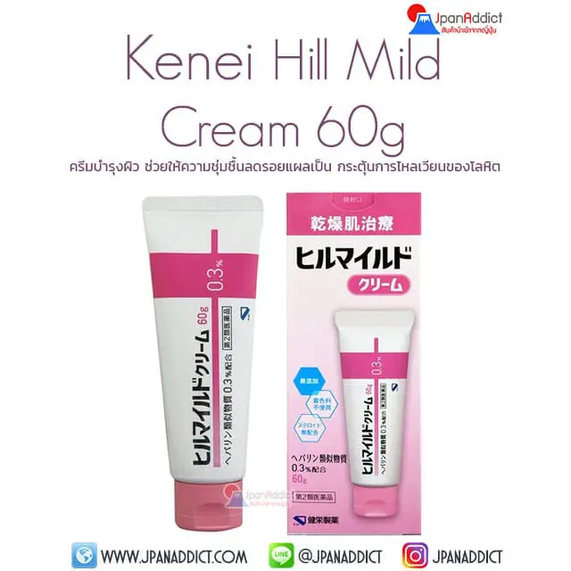 Kenei Hill Mild Lotion 60g โลชั่นบำรุงผิว ช่วยให้ความชุ่มชื้น ลดรอยแผลเป็น ช่วยสมานแผลให้เรียบเนียนได้ โดยมีจุดเด่นอยู่ที่การเพิ่มความชุ่มชื้น และถนอมผิว มีสารประกอบสำคัญคือ heparinoid ช่วยกระตุ้นการไหลเวียนของเลือดบริเวณผิวให้ดีขึ้น ส่งเสริมการสร้างผิวใหม่ จึงทำให้แผลสมานตัวได้ไวขึ้น ช่วยเพิ่มความสามารถในการปกป้องผิวและป้องกันไม่ให้สารแปลกปลอมเข้ามา มีฤทธิ์ต้านการอักเสบ ช่วยบรรเทาอาการผิวหยาบกร้านที่น่ารำคาญอันเนื่องมาจากการอักเสบ