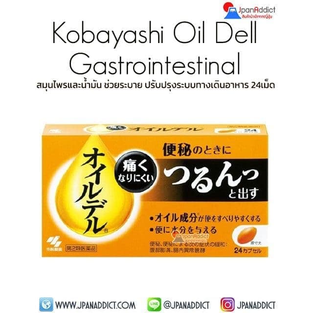 Kobayashi Oil Dell Gastrointestinal 24 Tablets สมุนไพรและน้ำมัน ช่วยระบาย ปรับปรุงระบบทางเดินอาหาร สำหรับผู้ที่มีปัญหาขับถ่ายยากจากอุจจาระที่แข็ง มีอาการท้องผูก ช่วยให้อุจาระนิ่มและ น้ำมันจากสารสกัดเม็ดระหุง Ricinus communis ช่วยเคลือบอุจาระและหล่อ ลื่นจึงช่วยให้ขับถ่ายง่าย หมดปัญหาถ่ายแข็ง