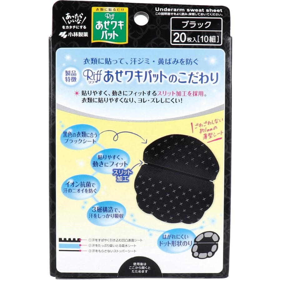 Kobayashi Riff Underarm Sweat Sheet Pad Black 20 pcs แผ่นซับเหงื่อใต้วงแขน แผ่นดูดซับเหงื่อผลิตจากCottonธรรมชาติ บางเฉียบเพียง 1.5มิลลิเมตร แทบไม่รู้สึกว่ามีแผ่นรองติดอยู่