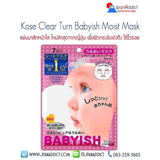 Kose Clear Turn Babyish Moisturizing Mask มาส์กขายดีอันดับ 1 ในญี่ปุ่น แผ่นมาส์กเพิ่มความชื้นให้กับผิวหน้า สูตรมอยซ์เจอร์ ให้ผิวชุ่มชื้นให้คุณผ่อนคลาย พร้อมบำรุง จากส่วนผสม ไฮยารูลอน amino acid chamomile extract ปราศจากสีและน้ำหอม และซิลิโคน สามารถแปะแผ่นมาส์กได้ทุกวัน 1 ห่อ ใช้ได้ 1 สัปดาห์