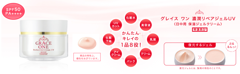 KOSE Grace One Perfect Gel Cream UV SPF50+ PA++++ 100g ครีมดูแลผิว ป้องกันรังสียูวี รอยด่างดำ ให้ผิวสว่างใสขึ้น ครีม 9in1 ตั้งแต่การดูแลผิวไปจนถึงการป้องกันรังสียูวี รอยด่างดำ และTone up ให้สว่างใสขึ้น เจลฟื้นฟูที่มีส่วนผสมของความงามมากมายจซึมลึกลงไปในผิว ให้ผิวชุ่มชื้นเปล่งปลั่งและเต่งตึง ด้วย SPF50 + PA ++++ จึงเป็นไอเท็มเดียวสำหรับการป้องกันรังสียูวีในเวลากลางวัน นอกจากนี้ ยังมีการเพิ่มส่วนผสมเพื่อความงามจำนวนมากสำหรับการดูแลผู้สูงวัยจากยุค 50 “Evolved Collagen CPX” และ “Elastin” กลิ่นดอกกุหลาบอ่อนๆ