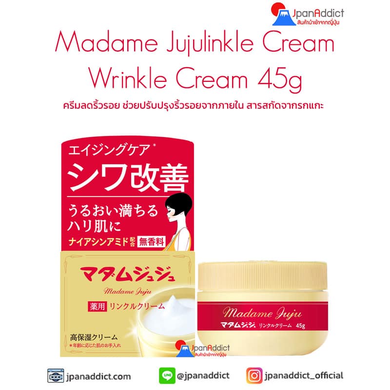 Madame Jujulinkle Cream Wrinkle Cream 45g ครีมลดริ้วรอยที่สร้างโดยแบรนด์ที่ขายมายาวนาน “Madame Juju” ไนอาซินาไมด์ซึ่งเป็นสารออกฤทธิ์ที่ช่วยลดเลือนริ้วรอยออกฤทธิ์บนผิวหนังชั้นนอกและชั้นหนังแท้ ช่วยปรับปรุงริ้วรอยจากภายในผิวหนัง