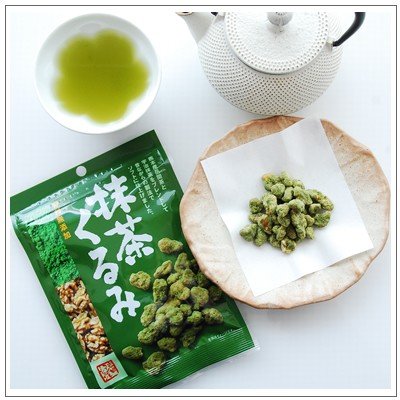 やわらかいくるみの豆菓子です。熊本産岳間茶と宇治抹茶をブレンドし、くるみにまぶしました。
