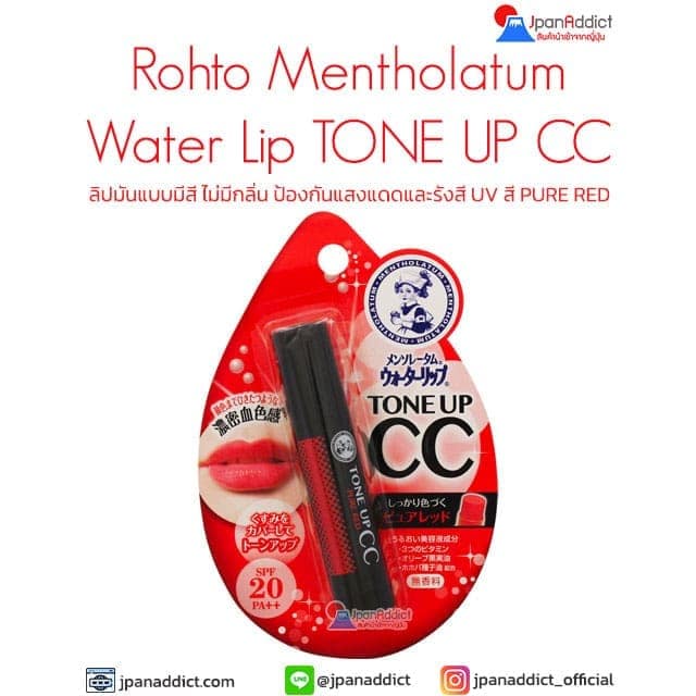 Mentholatum Water Lip TONE UP CC Pure Red ลิปบาล์ม ลิปมันแบบมีสี ไม่มีกลิ่น ป้องกันแสงแดดและรังสี UV SPF20 PA++ มีส่วนผสมของบิวตี้เอสเซ้นส์จำนวนมาก ให้ความชุ่มชื่นแก่ริมฝีปากและให้สีอ่อนๆ ที่ช่วยแก้ไขความหมองคล้ำ ริมฝีปากชุ่มชื่น เปล่งประกายและมันวาว ปราศจากน้ำหอม