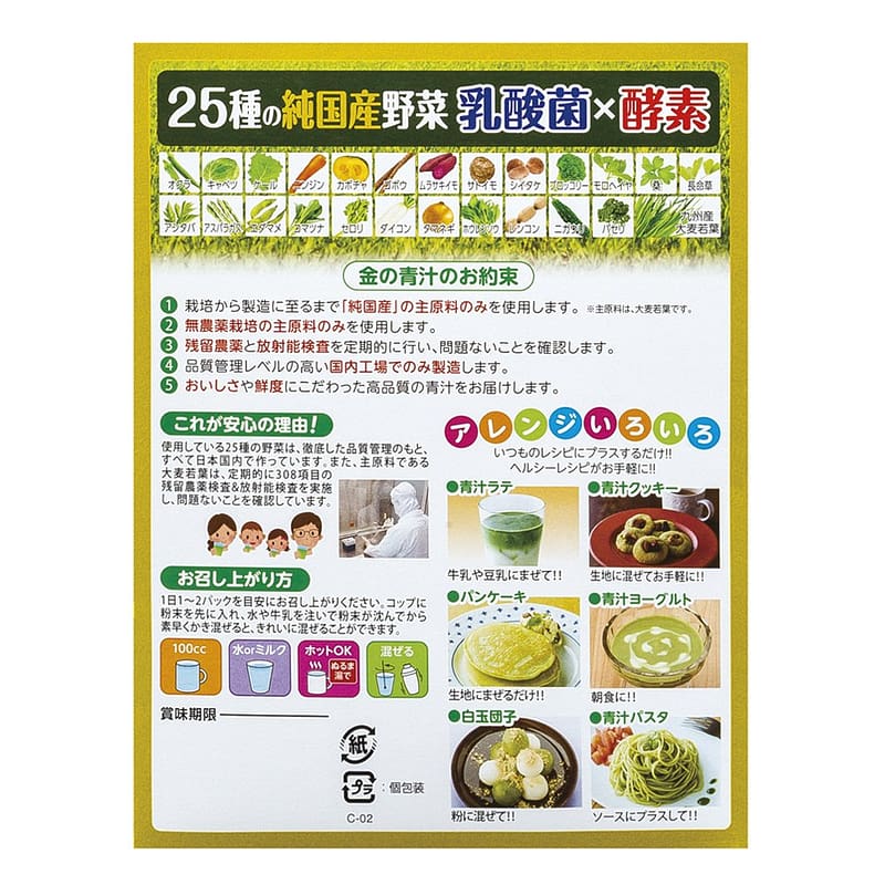 ผลิตจากใบอ่อนของข้าวบาร์เล่ย์ที่เก็บเกี่ยวจากเกาะคิวชู พร้อมอุดมไปด้วยผักอีก 25 ชนิด ที่ให้ประโยชน์และปลอดภัย มีแลคติคแบคทีเลียกว่า 200 ล้านตัวต่อ 1 ซอง ช่วยเรื่องการขับถ่ายของเสียได้อย่างดี