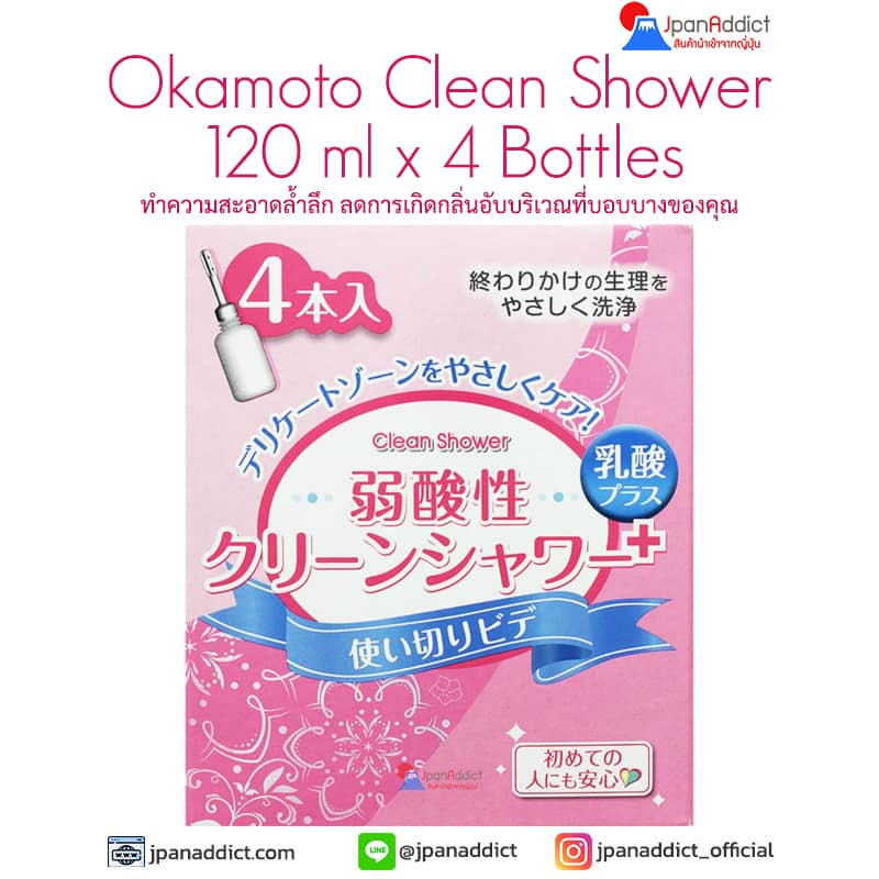 Okamoto Clean Shower 120 ml x 4 Bottles ทำความสะอาดล้ำลึก ลดการเกิดกลิ่นอับบริเวณน้องสาว ที่บอบบางของคุณ