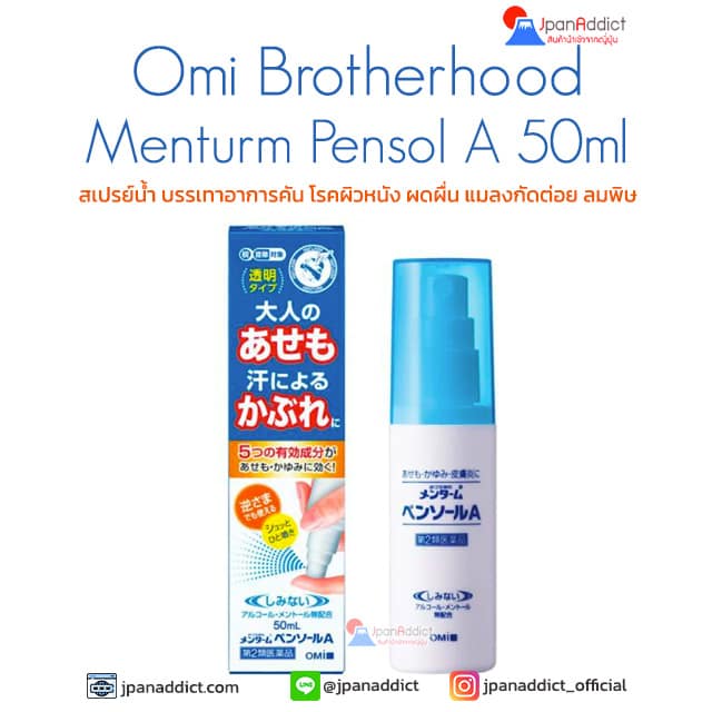 Omi Brotherhood Menturm Pensol SP 50ml สเปรย์น้ำ บรรเทาอาการคัน โรคผิวหนัง ผดผื่น แมลงกัดต่อย ลมพิษ ให้ความรู้สึกเรียบเนียน และไม่เหนียวเหนอะหนะ ไม่มีแอลกอฮอล์ เมนทอล หรือการบูร จึงไม่ทำให้ผิวหนังเป็นคราบ เนื่องจากเป็นชนิดสเปรย์ใช้งานง่าย มือของคุณจึงไม่สกปรก