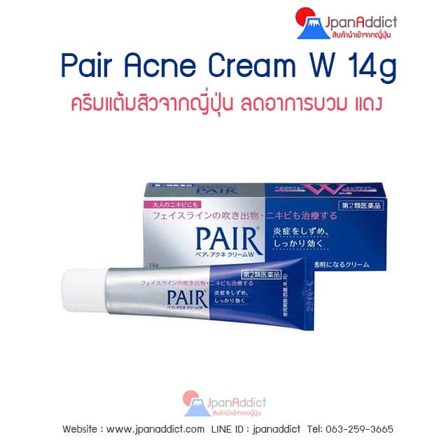 Pair Acne Cream W 14g ครีมแต้มสิวจากญี่ปุ่น ลดอาการบวม แดง เนื่องจากสิวอักเสบ ช่วยให้สิวยุบเร็วขึ้นและไม่ทิ้งรอยแผลเป็นหลังสิวหาย ทั้งยังลดอัตราการเกิดสิวอย่างได้ผล ผลิตภัณฑ์เพื่อผู้มีปัญหาสิวอย่างแท้จริง