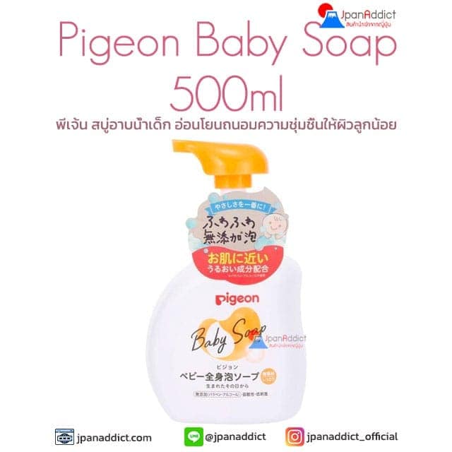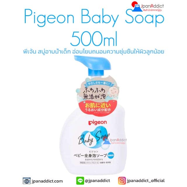 Pigeon Baby Soap 500ml ได้รับการพัฒนาให้มีคุณสมบัติคล้ายคลีงกับไขทารกแรกเกิด (Vernix caseosa) ที่มีหน้าที่ปกป้องผิวหนังแรกเกิดของทารก ประกอบด้วยส่วนผสมที่ให้ความชุ่มชื้น Baby Lipid (Cholesteryl Stearate และ Ceramide) ผ่านการทดสอบทางผิวหนังแล้ว (ไม่รับประกันว่าจะไม่แพ้สำหรับทุกคน หากมีอาการแพ้ให้หยุดใช้ทันที) ใช้ง่ายสำหรับคุณแม่ ปราศจากน้ำหอมและ พาราเบน