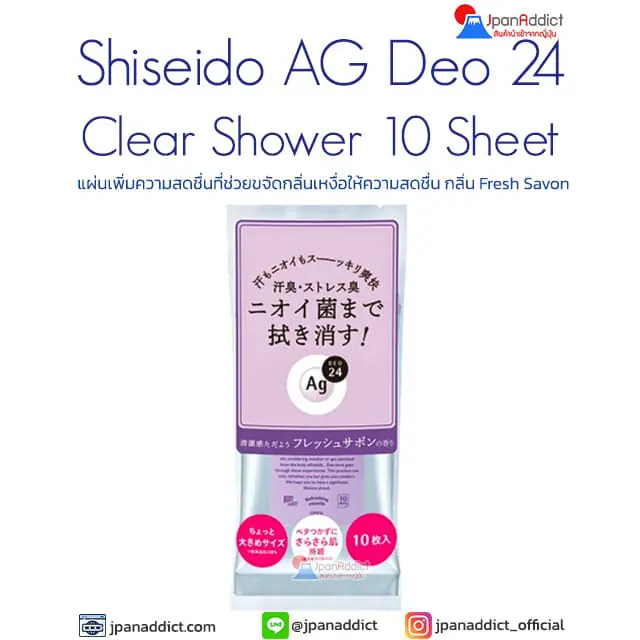 Shiseido AG Deo 24 Clear Shower 10 Sheet Fresh Savon แผ่นเพิ่มความสดชื่นที่ช่วยขจัดกลิ่นเหงื่อ ให้ความสดชื่นติดทนนาน