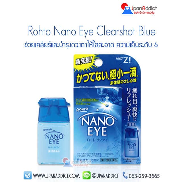 Rohto Nano Eye Clear Shot สีฟ้า ยาหยอดตาผสมวิตามินจากญี่ปุ่นช่วยเคลียร์และบำรุงดวงตาให้ใสสะอาดผสมนาโนช่วยป้องกันแสงแดดระหว่างวัน ทำให้ดวงตาใสปิ๊งดวงตาสู้แดด พร้อมตัวยาที่เข้มข้นเพียง1 หยด ช่วยปกป้องดวงตาจากแสงสีฟ้า จากหน้าจอคอม และสมาร์ทโฟน ช่วยรักษาและปกป้องอาการ เส้นเลือดในตาแดง ตาแดง จากการว่ายน้ำ และเจอแสงแดด อาการระคายเคืองตา ตาล้าจากการใส่คอนแทคเลนส์มองเห็นภาพเบลอ ปรับโฟกัสให้ดวงตา และทำให้ดวงตาชุ่มชื่น ด้วยไฮยาลูรอนนิค ผ่อนคลายด้วยความเย็นระดับ 6 และที่สำคัญ ไม่มีใส่สารกันบูด