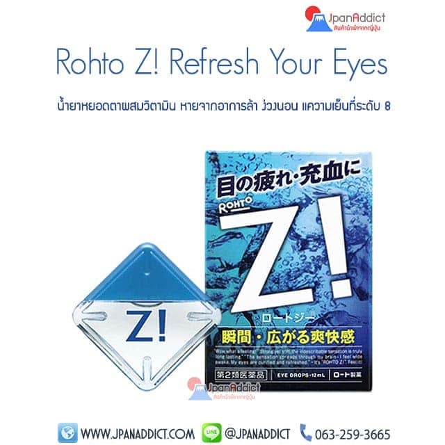 Rohto Z! Refresh Your Eyes น้ำยาหยอดตาจากญี่ปุ่น สูตรเย็น!! ระดับ8 ให้คุณรู้สึกเย็นสดชื่นอย่างสุดขั๊วดวงตาอย่างที่ไม่ค่อยรู้สึกมาก่อน หายจากอาการล้า ง่วงนอน และพร่ามั่วจากการใช้สายตาในการทำงานเอกสาร ใช้คอมพิวเตอร์ เล่นเกมส์ ดูหนัง จ้องมองโทรศัพท์สมาทโฟนเป็นเวลานาน และยังป้องกันจากโรคตาแดง จากติดเชื้อจากการว่ายน้ำ และฝุ่นละออง และมลพิษจากควัน