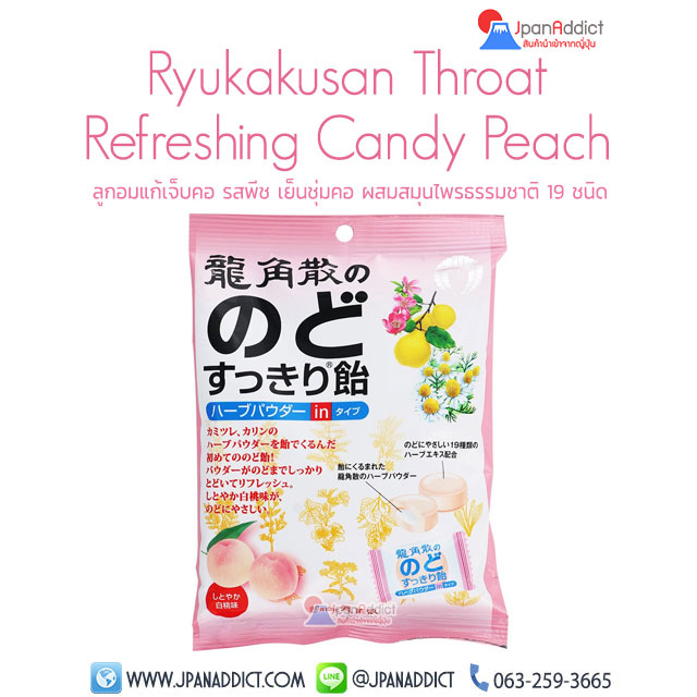 Ryukakusan Herbal Refreshing Candy Original Flavor 40g ริวคักซัง เฮอร์เบิล รีเฟรชชิ่ง แคนดี้ ออริจินอล เฟลเวอร์ (ลูกอมสมุนไพร รสดั้งเดิม)40กรัม ริวคักซังลูกอมสมุนไพรรสดั้งเดิม ลูกอมแก้เจ็บคอ รสดั้งเดิม แก้คอแห้งจากการสูบบุหรี่มากเกินไป บรรเทาอาการเจ็บคอ หวานกำลังดี ชุ่มคอ อร่อยเพลิน แถมมีวิตามินซี เบต้าแคโรทีน และสารอาหารอื่นๆที่ดีต่อผิวพรรณ เยื่อบุต่างๆ และดวงตา ส่วนประกอบ น้ำตาล, กลูโคสไซรัป, น้ำ, สารสกัดจากสมุนไพรธรรมชาติ, เมนทอล, แต่งรสธรรมชาติ และแต่งกลิ่นสังเคราะห์