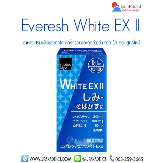 Everesh White EX II 180เม็ด อาหารเสริมเพื่อผิวขาวใส ลดริ้วรอยและจุดด่างดำ ฝ้า กระ สูตรใหม่