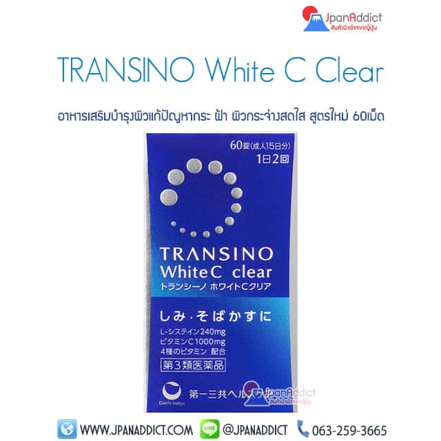TRANSINO White C Clear สูตรใหม่ อาหารเสริมเพื่อผิวขาวใส ด้วย L-cysteine วิตามินซีรวมเข้มข้นระงับการผลิตเมลานิน ที่ทำให้เกิด ฝ้ากระ และจุดด่าง ยี่ห้อดังจากญี่ปุ่นบรรเทาอาการ ดังต่อไปนี้ จุดดำ ผิวคล้ำ ฝ้า กระ ผิวโดนแดดเผา  ช่วยให้ผิวขาวใสขึ้นได้จริงขาวใส ราคาถูก รีวิว มากมาย