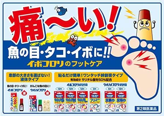 患部に塗布するとすばやく乾燥し、白い被膜をつくり、厚く硬くなった皮膚をやわらかくし、魚の目・タコ・イボを取り除きます。