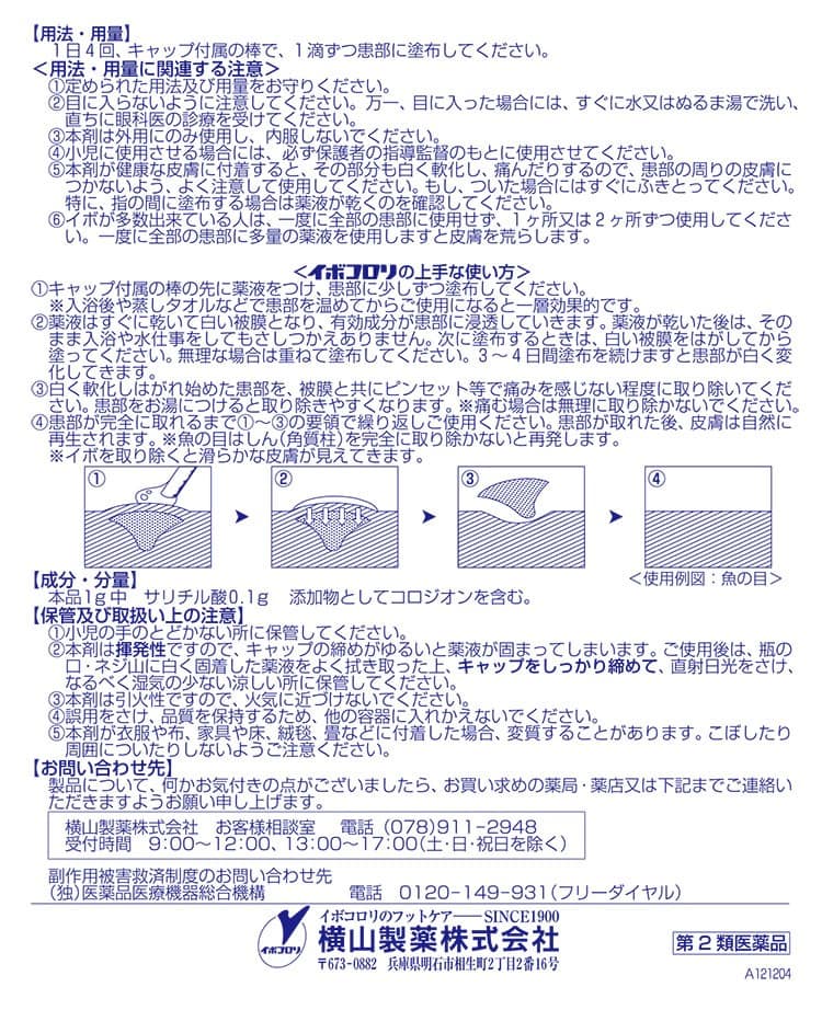 イボコロリは、サリチル酸の角質軟化溶解作用を利用した医薬品(角質剥離剤)です。